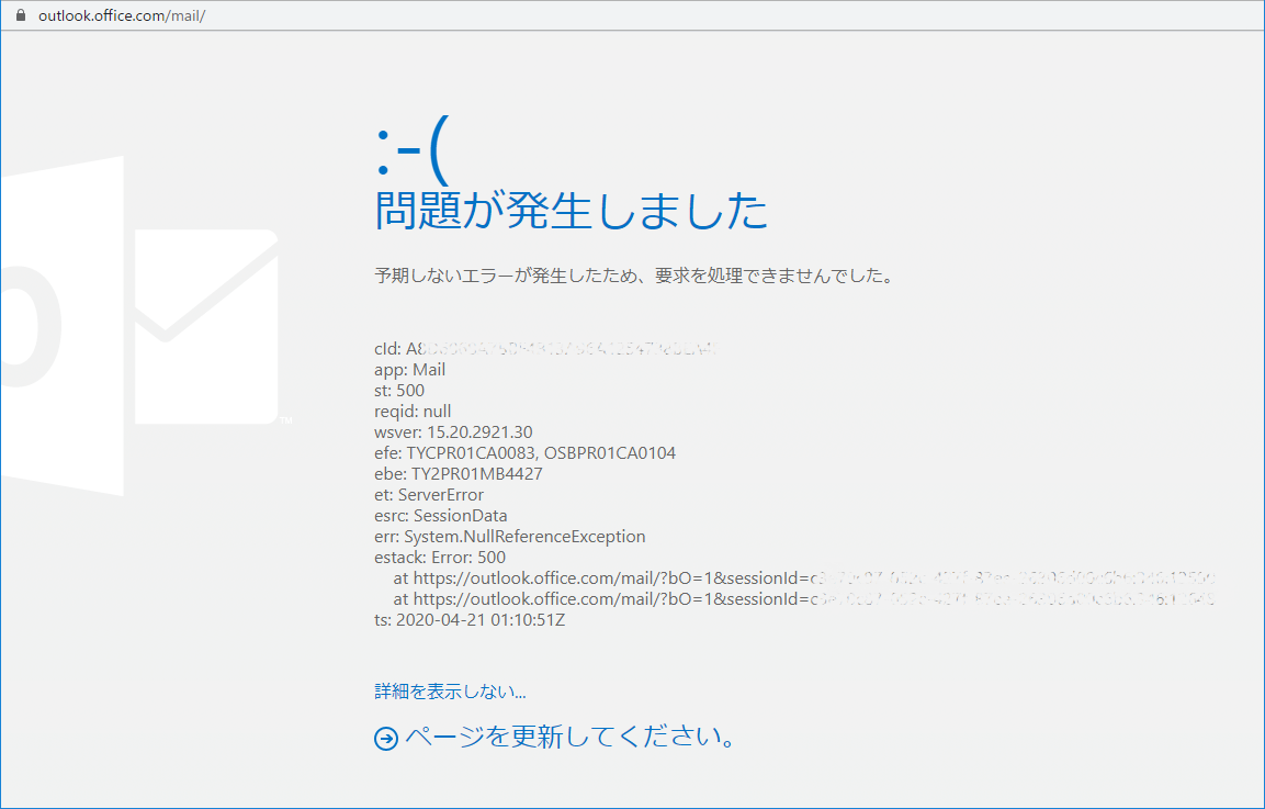 2020年4月21日 / 最終更新日時 : 2020年4月27日 matsumoto 一般通知 事務用メールシステムの障害について [2020.4.22 更新] 4/21 16時頃に問題が解消しましたことをお知らせいたします。 ——– 本日(4/21)の9時頃から、一部のユーザが下記のようなエラー画面になり、メールサーバにアクセスできない障害が発生しております。 Microsoftが原因を調査中ですが、Outlookアプリ、Outlook on the webのどちらからも同じエラーが発生するようです。 ご不便をおかけしてしまい大変申し訳ありませんが、解消までお待ちいただくようお願いいたします。