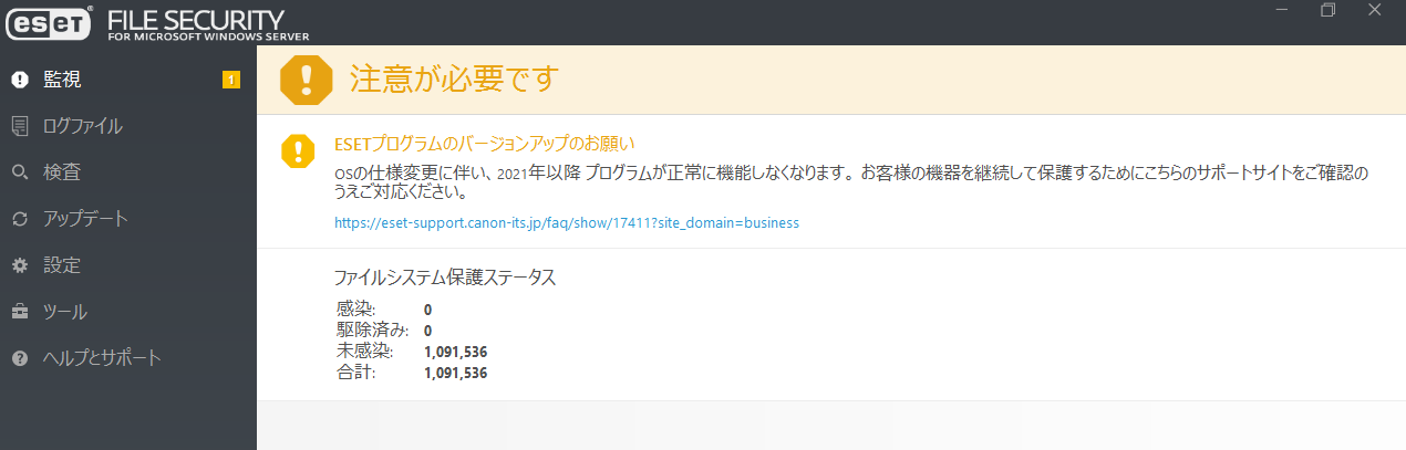 2021年2月24日 / 最終更新日時 : 2021年2月24日 osigami 一般通知 セキュリティソフトESET File Securityのバージョンアップについて 検証作業後にセキュリティソフトESET File Securityのバージョンアップをサーバ側で実施する予定です。 事務用シンクラ環境接続時に「ESETプログラムのバージョンアップのお願い」の画面が表示されることがありますが,本件でユーザ側で作業をしていただくことはございませんので,画面は×で閉じていただきますようお願いいたします。