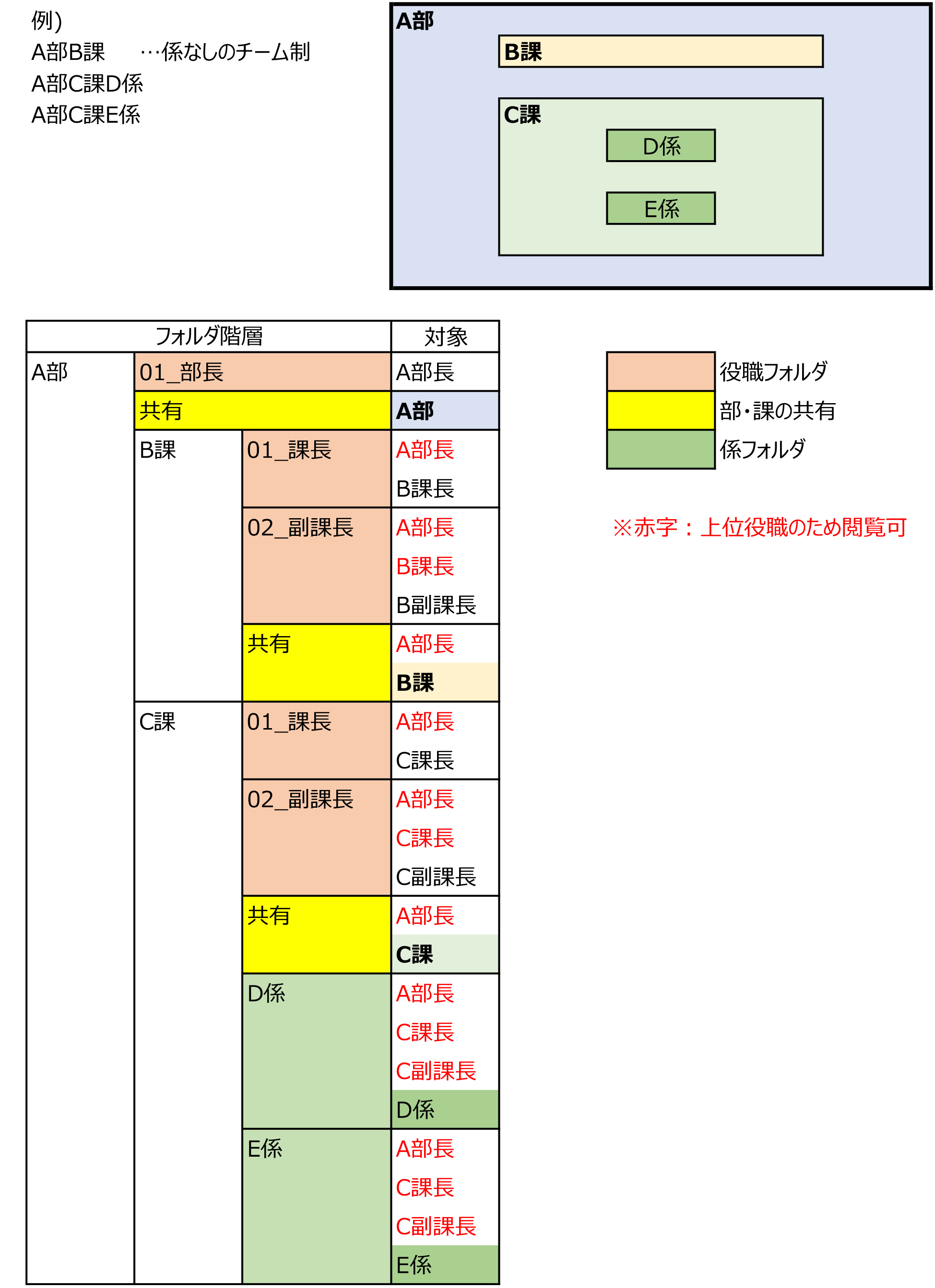 部内で課を横断する業務には部直下の「共有」という名称のフォルダを利用し、課内で係を横断する業務には課直下の「共有」という名称のフォルダを利用してください。