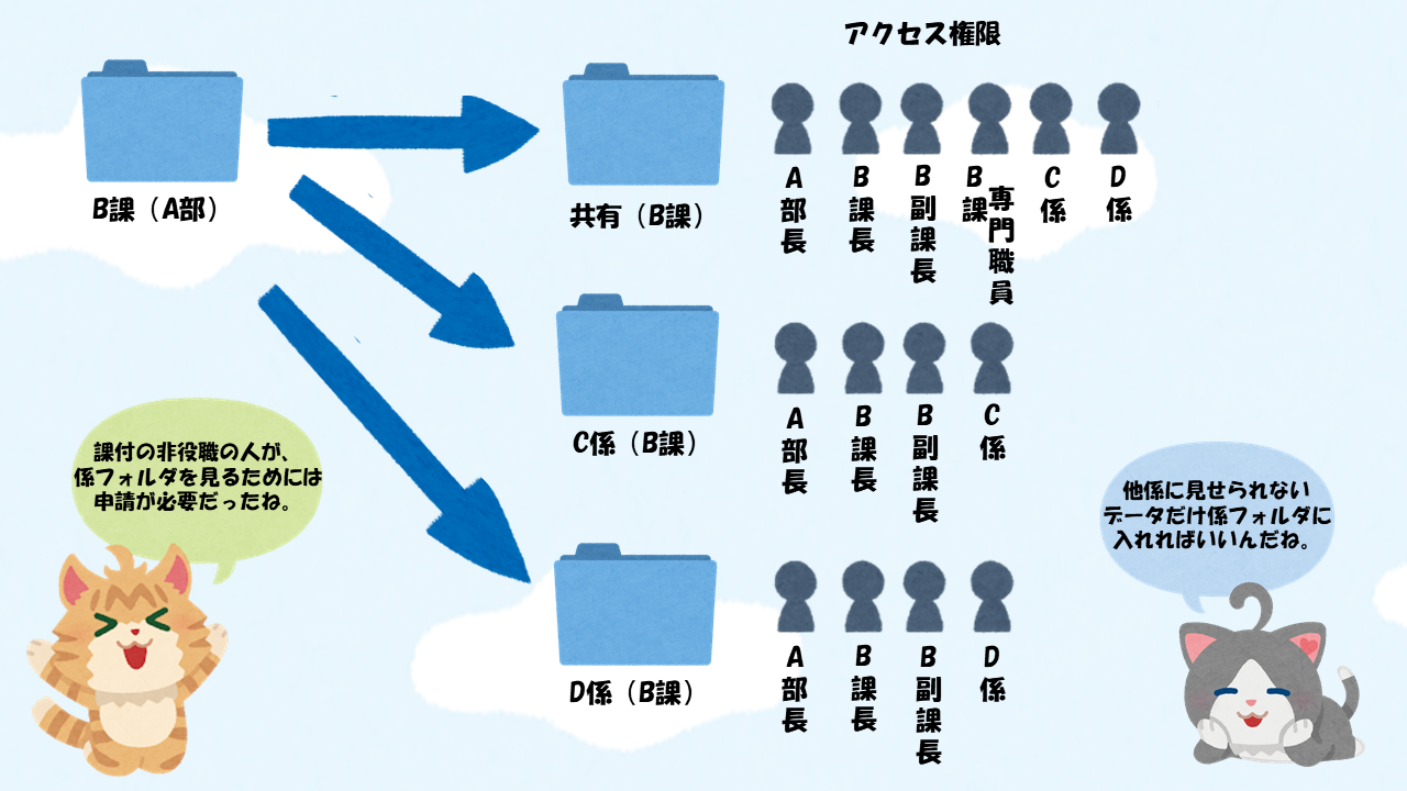 所属の部・課・係等のファイルのやりとりに利用している共有フォルダの閲覧権限は、人事上の所属に対して紐づいています。