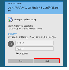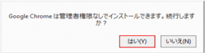 2018年6月18日 / 最終更新日時 : 2024年8月1日 osigami パソコン関連_O23 Google Chromeは利用できませんか? 申し訳ございません。Google Chromeの仕様変更により、個人領域へのインストールができなくなりました。(2024.8現在確認) 事務情報システムには、ブラウザとしてEdgeのほかFirefoxをご用意していますので、そちらのご利用をお願いします。 (↓以下は、以前の情報) 利用者自身がダウンロードしインストールすることで利用できます。 ※管理者のユーザー名とパスワードを要求されますが、いいえを選択しインストールすることができます。