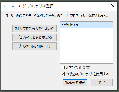 2.ユーザープロファイルの選択画面が開くので、「default-esr」をクリックし、「今後このプロファイルを使用する」にチェックが入っていることを確認して「Firefoxを起動」をクリック
